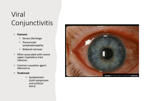 Viral Conjunctivitis %u2022 Features: %u2022 Serous discharge %u2022 Preauricular lymphadenopathy%u2022 Bilateral red eyes%u2022 Often associated with recent upper respiratory tract infection%u2022 Common causative agent: Adenovirus%u2022 Treatment: %u2022 Symptomatic (cold compresses and artificial tears)This Photo by Unknown Author is licensed under CC BY-SA-NC