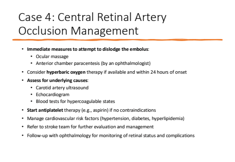 Case 4: Central Retinal Artery Occlusion Management%u2022 Immediate measures to attempt to dislodge the embolus:%u2022 Ocular massage%u2022 Anterior chamber paracentesis (by an ophthalmologist)%u2022 Consider hyperbaric oxygen therapy if available and within 24 hours of onset%u2022 Assess for underlying causes:%u2022 Carotid artery ultrasound%u2022 Echocardiogram%u2022 Blood tests for hypercoagulable states%u2022 Start antiplatelet therapy (e.g., aspirin) if no contraindications%u2022 Manage cardiovascular risk factors (hypertension, diabetes, hyperlipidemia)%u2022 Refer to stroke team for further evaluation and management%u2022 Follow-up with ophthalmology for monitoring of retinal status and complications