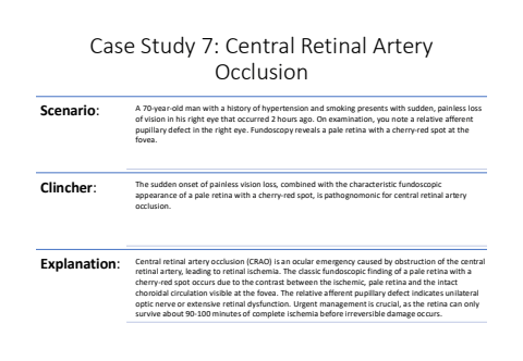Case Study 7: Central Retinal Artery OcclusionScenario:A 70-year-old man with a history of hypertension and smoking presents with sudden, painless loss of vision in his right eye that occurred 2 hours ago. On examination, you note a relative afferent pupillary defect in the right eye. Fundoscopy reveals a pale retina with a cherry-red spot at the fovea.Clincher:The sudden onset of painless vision loss, combined with the characteristic fundoscopic appearance of a pale retina with a cherry-red spot, is pathognomonic for central retinal artery occlusion.Explanation:Central retinal artery occlusion (CRAO) is an ocular emergency caused by obstruction of the central retinal artery, leading to retinal ischemia. The classic fundoscopic finding of a pale retina with a cherry-red spot occurs due to the contrast between the ischemic, pale retina and the intact choroidal circulation visible at the fovea. The relative afferent pupillary defect indicates unilateral optic nerve or extensive retinal dysfunction. Urgent management is crucial, as the retina can only survive about 90-100 minutes of complete ischemia before irreversible damage occurs.