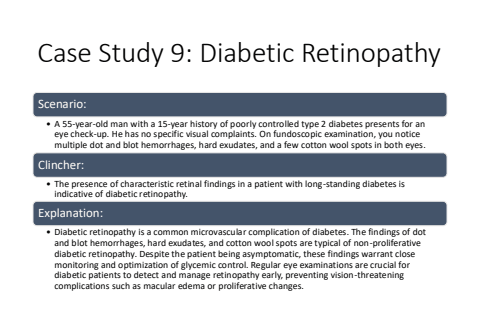 Case Study 9: Diabetic RetinopathyScenario:%u2022 A 55-year-old man with a 15-year history of poorly controlled type 2 diabetes presents for an eye check-up. He has no specific visual complaints. On fundoscopic examination, you notice multiple dot and blot hemorrhages, hard exudates, and a few cotton wool spots in both eyes.Clincher:%u2022 The presence of characteristic retinal findings in a patient with long-standing diabetes is indicative of diabetic retinopathy.Explanation:%u2022 Diabetic retinopathy is a common microvascular complication of diabetes. The findings of dot and blot hemorrhages, hard exudates, and cotton wool spots are typical of non-proliferative diabetic retinopathy. Despite the patient being asymptomatic, these findings warrant close monitoring and optimization of glycemic control. Regular eye examinations are crucial for diabetic patients to detect and manage retinopathy early, preventing vision-threatening complications such as macular edema or proliferative changes.