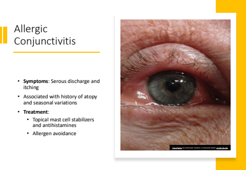 Allergic Conjunctivitis%u2022 Symptoms: Serous discharge and itching%u2022 Associated with history of atopy and seasonal variations%u2022 Treatment:%u2022 Topical mast cell stabilizers and antihistamines%u2022 Allergen avoidanceThis Photo by Unknown Author is licensed under CC BY-SA-NC