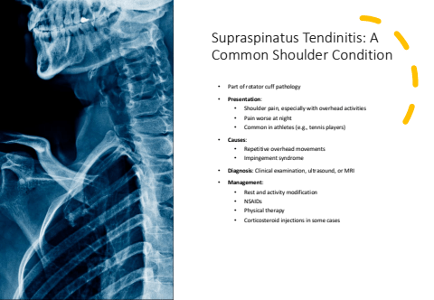 Supraspinatus Tendinitis: A Common Shoulder Condition%u2022 Part of rotator cuff pathology%u2022 Presentation:%u2022 Shoulder pain, especially with overhead activities%u2022 Pain worse at night%u2022 Common in athletes (e.g., tennis players)%u2022 Causes:%u2022 Repetitive overhead movements%u2022 Impingement syndrome%u2022 Diagnosis: Clinical examination, ultrasound, or MRI%u2022 Management:%u2022 Rest and activity modification%u2022 NSAIDs%u2022 Physical therapy%u2022 Corticosteroid injections in some cases