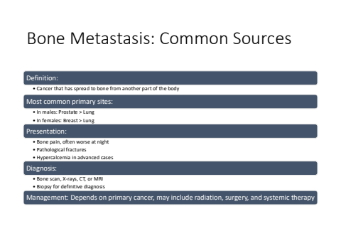 Bone Metastasis: Common SourcesDefinition:%u2022 Cancer that has spread to bone from another part of the bodyMost common primary sites:%u2022 In males: Prostate > Lung%u2022 In females: Breast > LungPresentation:%u2022 Bone pain, often worse at night%u2022 Pathological fractures%u2022 Hypercalcemia in advanced casesDiagnosis:%u2022 Bone scan, X-rays, CT, or MRI%u2022 Biopsy for definitive diagnosisManagement: Depends on primary cancer, may include radiation, surgery, and systemic therapy