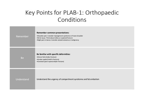 Key Points for PLAB-1: Orthopaedic ConditionsRemember common presentations:%u2022Shoulder pain: Consider impingement syndrome or frozen shoulder%u2022Wrist injury: Think about Colles or scaphoid fracture%u2022Night pain in bones: Consider osteoid osteoma or malignancyRememberBe familiar with specific deformities:%u2022Dinner-fork (Colles fracture)%u2022Garden spade (Smith's fracture)%u2022Gunstock (post-supracondylar fracture)BeUnderstand Understand the urgency of compartment syndrome and fat embolism