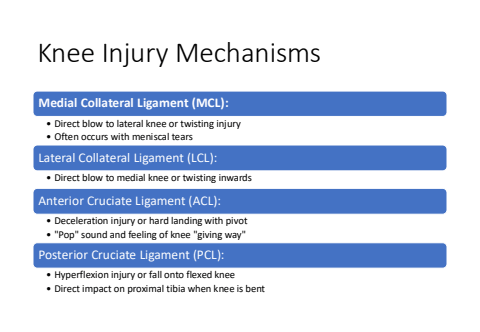 Knee Injury MechanismsMedial Collateral Ligament (MCL):%u2022 Direct blow to lateral knee or twisting injury%u2022 Often occurs with meniscal tearsLateral Collateral Ligament (LCL):%u2022 Direct blow to medial knee or twisting inwardsAnterior Cruciate Ligament (ACL):%u2022 Deceleration injury or hard landing with pivot%u2022 \Posterior Cruciate Ligament (PCL):%u2022 Hyperflexion injury or fall onto flexed knee%u2022 Direct impact on proximal tibia when knee is bent