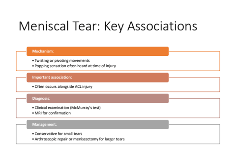 Meniscal Tear: Key Associations%u2022 Twisting or pivoting movements%u2022 Popping sensation often heard at time of injuryMechanism:%u2022Often occurs alongside ACL injuryImportant association:%u2022Clinical examination (McMurray's test)%u2022MRI for confirmationDiagnosis:%u2022Conservative for small tears%u2022Arthroscopic repair or meniscectomy for larger tearsManagement:
