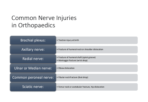 Common Nerve Injuries in OrthopaedicsBrachial plexus: %u2022 Traction injury at birthAxillary nerve: %u2022 Fracture of humeral neck or shoulder dislocation%u2022 Fracture of humeral shaft (spiral groove) Radial nerve: %u2022 Monteggia fracture (wrist drop)Ulnar or Median nerve: %u2022 Elbow dislocationCommon peroneal nerve: %u2022 Fibular neck fracture (foot drop)Sciatic nerve: %u2022 Femur neck or acetabular fracture, hip dislocation