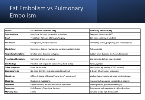 Fat Embolism vs Pulmonary EmbolismFeature Fat Embolism Syndrome (FES) Pulmonary Embolism (PE)Common Cause Long bone fractures, orthopedic procedures Deep vein thrombosis (DVT)Onset Typically 24-72 hours after injury/surgery Can occur suddenly at any timeRisk Factors Young adults, multiple fractures Immobility, cancer, pregnancy, oral contraceptivesClassic Triad Respiratory distress, neurological symptoms, petechial rash Not applicableRespiratory Symptoms Gradual onset dyspnea, tachypnea Sudden onset dyspnea, chest pain, tachypneaNeurological Symptoms Confusion, drowsiness, coma Less common, but can cause syncopeSkin Findings Petechial rash (especially conjunctiva, chest, axilla) Rarely, cyanosisOther Symptoms Fever, tachycardia Hemoptysis, leg swelling (if DVT present)Diagnostic Tests No single definitive test; diagnosis often clinical D-dimer, CT pulmonary angiogramChest X-ray Diffuse, bilateral infiltrates (\Wedge-shaped opacity, elevated hemidiaphragmBlood Gas Hypoxemia, hypocapnia Hypoxemia, hypocapnia, increased A-a gradientTreatment Supportive care, possible mechanical ventilation Anticoagulation, possible thrombolysisPrevention Early fixation of long bone fractures Prophylactic anticoagulation in high-risk patientsMortality Rate 5-15% Variable, can be high if massive PE
