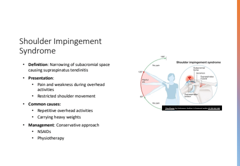 Shoulder Impingement Syndrome%u2022 Definition: Narrowing of subacromial space causing supraspinatus tendinitis%u2022 Presentation:%u2022 Pain and weakness during overhead activities%u2022 Restricted shoulder movement%u2022 Common causes:%u2022 Repetitive overhead activities%u2022 Carrying heavy weights%u2022 Management: Conservative approach%u2022 NSAIDs%u2022 PhysiotherapyThis Photo by Unknown Author is licensed under CC BY-NC-ND