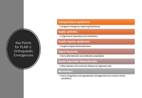 Key Points for PLAB-1: Orthopaedic EmergenciesCompartment syndrome:%u2022 Surgical emergency requiring fasciotomySeptic arthritis:%u2022 Urgent joint aspiration and antibioticsCauda equina syndrome:%u2022 Urgent surgical decompressionOpen fractures:%u2022 Early debridement and antibiotic prophylaxisAcute traumatic hemarthrosis:%u2022 May indicate intra-articular fracture or ligament tearRemember:%u2022 Early recognition and appropriate management are crucial in these conditions