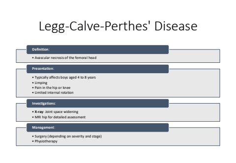 Legg-Calve-Perthes' Disease%u2022 Avascular necrosis of the femoral headDefinition:%u2022 Typically affects boys aged 4 to 8 years%u2022 Limping%u2022 Pain in the hip or knee%u2022 Limited internal rotationPresentation:%u2022 X-ray: Joint space widening%u2022 MRI hip for detailed assessmentInvestigations:%u2022 Surgery (depending on severity and stage)%u2022 PhysiotherapyManagement:
