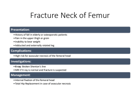 Fracture Neck of FemurPresentation:%u2022History of fall in elderly or osteoporotic patients%u2022Pain in the upper thigh or groin%u2022Inability to bear weight%u2022Adducted and externally rotated legComplications:%u2022High risk for avascular necrosis of the femoral headInvestigations:%u2022X-ray: Broken Shenton's line%u2022MRI if X-ray is normal and fracture is suspectedManagement:%u2022Internal fixation of the femoral head%u2022Total Hip Replacement in case of avascular necrosis