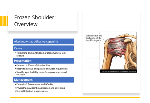 Frozen Shoulder: OverviewThis Photo by Unknown Author is licensed under CC BY-NC-NDAlso known as adhesive capsulitisCause:%u2022 Thickening and contraction of glenohumeral joint capsulePresentation:%u2022 Pain and stiffness of the shoulder%u2022 Restricted active and passive shoulder movements%u2022 Specific sign: Inability to perform passive external rotationManagement:%u2022 Pain relief: Paracetamol and NSAIDs%u2022 Physiotherapy: Joint mobilization and stretching%u2022 Steroid injection in some cases