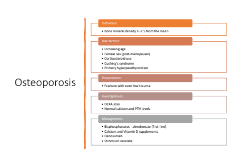 Osteoporosis%u2022 Bone mineral density %u2264 -2.5 from the meanDefinition:%u2022 Increasing age%u2022 Female sex (post-menopausal)%u2022 Corticosteroid use%u2022 Cushing's syndrome%u2022 Primary hyperparathyroidismRisk factors:%u2022 Fracture with even low traumaPresentation:%u2022 DEXA scan%u2022 Normal calcium and PTH levelsInvestigations:%u2022 Bisphosphonates - alendronate (first-line)%u2022 Calcium and Vitamin D supplements%u2022 Denosumab%u2022 Strontium ranelateManagement:
