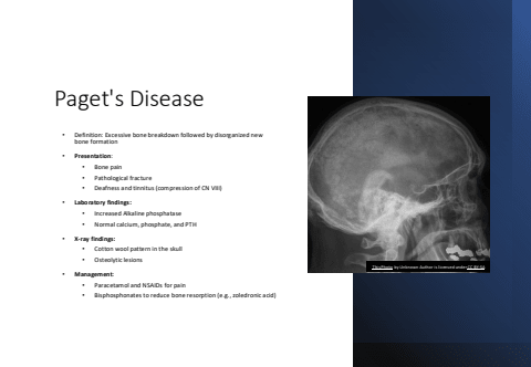 Paget's Disease%u2022 Definition: Excessive bone breakdown followed by disorganized new bone formation%u2022 Presentation:%u2022 Bone pain%u2022 Pathological fracture%u2022 Deafness and tinnitus (compression of CN VIII)%u2022 Laboratory findings:%u2022 Increased Alkaline phosphatase%u2022 Normal calcium, phosphate, and PTH%u2022 X-ray findings:%u2022 Cotton wool pattern in the skull%u2022 Osteolytic lesions%u2022 Management:%u2022 Paracetamol and NSAIDs for pain%u2022 Bisphosphonates to reduce bone resorption (e.g., zoledronic acid)This Photo by Unknown Author is licensed under CC BY-SA
