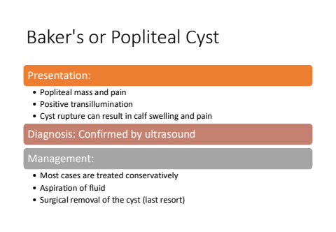 Baker's or Popliteal CystPresentation:%u2022 Popliteal mass and pain%u2022 Positive transillumination%u2022 Cyst rupture can result in calf swelling and painDiagnosis: Confirmed by ultrasoundManagement:%u2022 Most cases are treated conservatively%u2022 Aspiration of fluid%u2022 Surgical removal of the cyst (last resort)