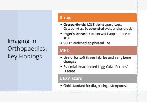 Imaging in Orthopaedics: Key FindingsX-ray:%u2022 Osteoarthritis: LOSS (Joint space Loss, Osteophytes, Subchondral cysts and sclerosis)%u2022 Paget's Disease: Cotton wool appearance in skull%u2022 SCFE: Widened epiphyseal lineMRI:%u2022 Useful for soft tissue injuries and early bone changes%u2022 Essential in suspected Legg-Calve-Perthes' DiseaseDEXA scan:%u2022 Gold standard for diagnosing osteoporosis