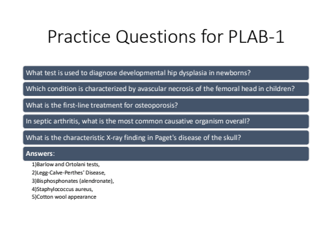 Practice Questions for PLAB-1What test is used to diagnose developmental hip dysplasia in newborns?Which condition is characterized by avascular necrosis of the femoral head in children?What is the first-line treatment for osteoporosis?In septic arthritis, what is the most common causative organism overall?What is the characteristic X-ray finding in Paget's disease of the skull?Answers:1)Barlow and Ortolani tests,2)Legg-Calve-Perthes' Disease,3)Bisphosphonates (alendronate),4)Staphylococcus aureus,5)Cotton wool appearance