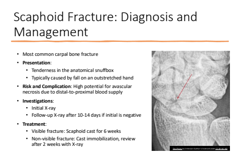 Scaphoid Fracture: Diagnosis and Management%u2022 Most common carpal bone fracture%u2022 Presentation:%u2022 Tenderness in the anatomical snuffbox%u2022 Typically caused by fall on an outstretched hand%u2022 Risk and Complication: High potential for avascular necrosis due to distal-to-proximal blood supply%u2022 Investigations:%u2022 Initial X-ray%u2022 Follow-up X-ray after 10-14 days if initial is negative%u2022 Treatment:%u2022 Visible fracture: Scaphoid cast for 6 weeks%u2022 Non-visible fracture: Cast immobilization, review after 2 weeks with X-rayThis Photo by Unknown Author is licensed under CC BY-NC-ND