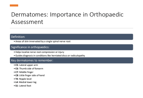Dermatomes: Importance in Orthopaedic AssessmentDefinition:%u2022Areas of skin innervated by a single spinal nerve rootSignificance in orthopaedics:%u2022Helps localize nerve root compression or injury%u2022Guides diagnosis in conditions like herniated discs or radiculopathyKey dermatomes to remember:%u2022 C5: Lateral upper arm%u2022 C6: Thumb side of forearm%u2022 C7: Middle finger%u2022 C8: Little finger side of hand%u2022 T4: Nipple level%u2022 L4: Medial lower leg%u2022 S1: Lateral foot