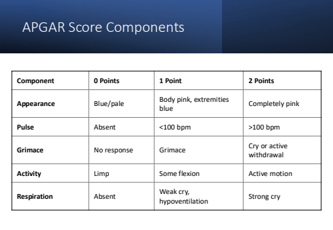 APGAR Score ComponentsComponent 0 Points 1 Point 2 PointsAppearance Blue/pale Body pink, extremities blue Completely pinkPulse Absent <100 bpm >100 bpmGrimace No response Grimace Cry or active withdrawalActivity Limp Some flexion Active motionRespiration Absent Weak cry, hypoventilation Strong cry
