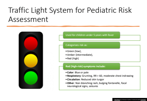 Traffic Light System for Pediatric Risk AssessmentUsed for children under 5 years with fever%u2022Green (low),%u2022Amber (intermediate),%u2022Red (high)Categorizes risk as:%u2022Color: Blue or pale%u2022Respiratory: Grunting, RR > 60, moderate chest indrawing%u2022Circulation: Reduced skin turgor%u2022Other: Non-blanching rash, bulging fontanelle, focal neurological signs, seizuresRed (high-risk) symptoms include:This Photo by Unknown Author is licensed under CC BY-NC