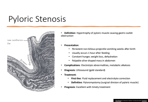 Pyloric Stenosis%u2022 Definition: Hypertrophy of pyloric muscle causing gastric outlet obstruction%u2022 Presentation:%u2022 Persistent non-bilious projectile vomiting weeks after birth%u2022 Usually occurs 1 hour after feeding%u2022 Constant hunger, weight loss, dehydration%u2022 Palpable olive-shaped mass in abdomen%u2022 Complications: Electrolyte abnormalities, metabolic alkalosis%u2022 Diagnosis: Ultrasound (gold standard)%u2022 Treatment:%u2022 First-line: Fluid replacement and electrolyte correction%u2022 Definitive: Pyloromyotomy (surgical division of pyloric muscle)%u2022 Prognosis: Excellent with timely treatmentThis Photo by Unknown Author is licensed under CC BY-SA