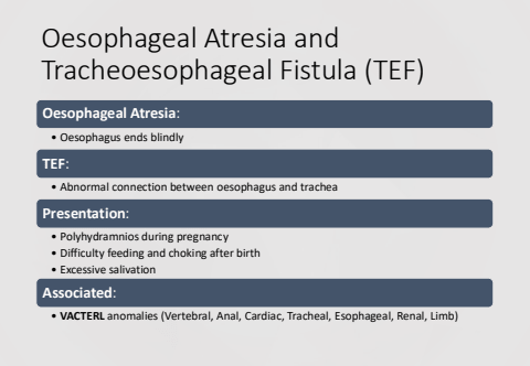 Oesophageal Atresia and Tracheoesophageal Fistula (TEF)Oesophageal Atresia:%u2022 Oesophagus ends blindlyTEF:%u2022 Abnormal connection between oesophagus and tracheaPresentation:%u2022 Polyhydramnios during pregnancy%u2022 Difficulty feeding and choking after birth%u2022 Excessive salivationAssociated:%u2022 VACTERL anomalies (Vertebral, Anal, Cardiac, Tracheal, Esophageal, Renal, Limb)