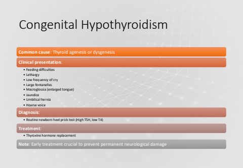 Congenital HypothyroidismCommon cause: Thyroid agenesis or dysgenesisClinical presentation:%u2022 Feeding difficulties%u2022 Lethargy%u2022 Low frequency of cry%u2022 Large fontanelles%u2022 Macroglossia (enlarged tongue)%u2022 Jaundice%u2022 Umbilical hernia%u2022 Hoarse voiceDiagnosis:%u2022 Routine newborn heel prick test (High TSH, low T4)Treatment:%u2022 Thyroxine hormone replacementNote: Early treatment crucial to prevent permanent neurological damage