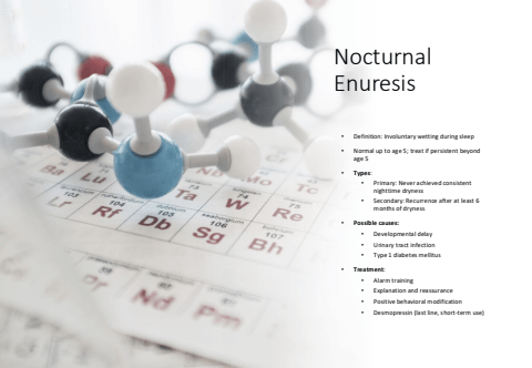 Nocturnal Enuresis%u2022 Definition: Involuntary wetting during sleep%u2022 Normal up to age 5; treat if persistent beyond age 5%u2022 Types:%u2022 Primary: Never achieved consistent nighttime dryness%u2022 Secondary: Recurrence after at least 6 months of dryness%u2022 Possible causes:%u2022 Developmental delay%u2022 Urinary tract infection%u2022 Type 1 diabetes mellitus%u2022 Treatment:%u2022 Alarm training%u2022 Explanation and reassurance%u2022 Positive behavioral modification%u2022 Desmopressin (last line, short-term use)
