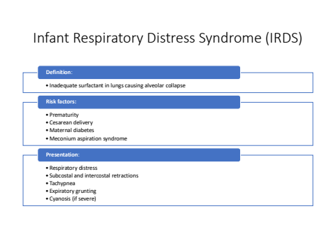 Infant Respiratory Distress Syndrome (IRDS)%u2022 Inadequate surfactant in lungs causing alveolar collapseDefinition:%u2022 Prematurity%u2022 Cesarean delivery%u2022Maternal diabetes%u2022Meconium aspiration syndromeRisk factors:%u2022Respiratory distress%u2022 Subcostal and intercostal retractions%u2022 Tachypnea%u2022 Expiratory grunting%u2022Cyanosis (if severe)Presentation: