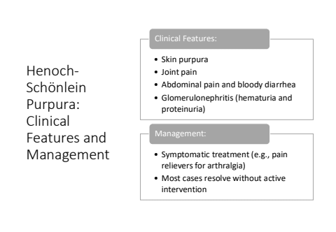 HenochSch%u00f6nlein Purpura: Clinical Features and Management%u2022 Skin purpura%u2022 Joint pain%u2022 Abdominal pain and bloody diarrhea%u2022 Glomerulonephritis (hematuria and proteinuria)Clinical Features:%u2022 Symptomatic treatment (e.g., pain relievers for arthralgia)%u2022 Most cases resolve without active interventionManagement: