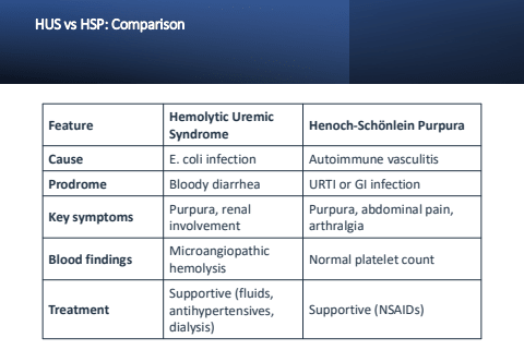 HUS vs HSP: ComparisonFeature Hemolytic Uremic Syndrome Henoch-Sch%u00f6nlein PurpuraCause E. coli infection Autoimmune vasculitisProdrome Bloody diarrhea URTI or GI infectionKey symptoms Purpura, renal involvementPurpura, abdominal pain, arthralgiaBlood findings Microangiopathic hemolysis Normal platelet countTreatmentSupportive (fluids, antihypertensives, dialysis)Supportive (NSAIDs)