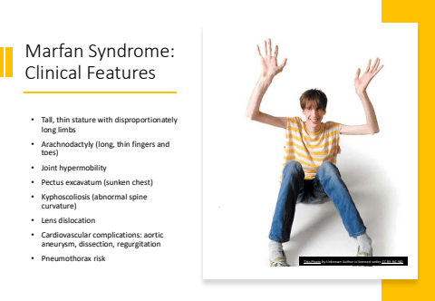 Marfan Syndrome: Clinical Features%u2022 Tall, thin stature with disproportionately long limbs%u2022 Arachnodactyly (long, thin fingers and toes)%u2022 Joint hypermobility%u2022 Pectus excavatum (sunken chest)%u2022 Kyphoscoliosis (abnormal spine curvature)%u2022 Lens dislocation%u2022 Cardiovascular complications: aortic aneurysm, dissection, regurgitation%u2022 Pneumothorax risk This Photo by Unknown Author is licensed under CC BY-NC-ND