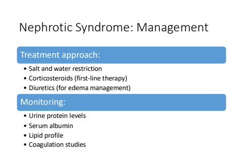 Nephrotic Syndrome: ManagementTreatment approach:%u2022 Salt and water restriction%u2022 Corticosteroids (first-line therapy)%u2022 Diuretics (for edema management)Monitoring:%u2022 Urine protein levels%u2022 Serum albumin%u2022 Lipid profile%u2022 Coagulation studies