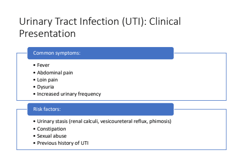 Urinary Tract Infection (UTI): Clinical Presentation%u2022 Fever%u2022 Abdominal pain%u2022 Loin pain%u2022 Dysuria%u2022 Increased urinary frequencyCommon symptoms:%u2022 Urinary stasis (renal calculi, vesicoureteral reflux, phimosis)%u2022 Constipation%u2022 Sexual abuse%u2022 Previous history of UTIRisk factors: