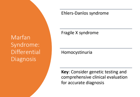 Marfan Syndrome: Differential DiagnosisEhlers-Danlos syndromeFragile X syndromeHomocystinuriaKey: Consider genetic testing and comprehensive clinical evaluation for accurate diagnosis