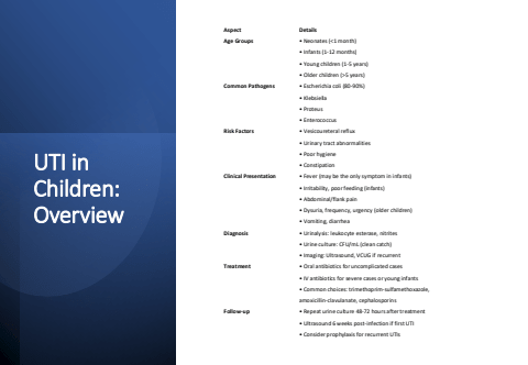 UTI in Children: OverviewAspect DetailsAge Groups %u2022 Neonates (<1 month)%u2022 Infants (1-12 months)%u2022 Young children (1-5 years)%u2022 Older children (>5 years)Common Pathogens %u2022 Escherichia coli (80-90%)%u2022 Klebsiella%u2022 Proteus%u2022 EnterococcusRisk Factors %u2022 Vesicoureteral reflux%u2022 Urinary tract abnormalities%u2022 Poor hygiene%u2022 ConstipationClinical Presentation %u2022 Fever (may be the only symptom in infants)%u2022 Irritability, poor feeding (infants)%u2022 Abdominal/flank pain%u2022 Dysuria, frequency, urgency (older children)%u2022 Vomiting, diarrheaDiagnosis %u2022 Urinalysis: leukocyte esterase, nitrites%u2022 Urine culture: CFU/mL (clean catch)%u2022 Imaging: Ultrasound, VCUG if recurrentTreatment %u2022 Oral antibiotics for uncomplicated cases%u2022 IV antibiotics for severe cases or young infants%u2022 Common choices: trimethoprim-sulfamethoxazole,amoxicillin-clavulanate, cephalosporinsFollow-up %u2022 Repeat urine culture 48-72 hours after treatment%u2022 Ultrasound 6 weeks post-infection if first UTI%u2022 Consider prophylaxis for recurrent UTIs