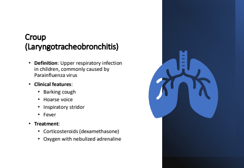 Croup (Laryngotracheobronchitis)%u2022 Definition: Upper respiratory infection in children, commonly caused by Parainfluenza virus%u2022 Clinical features:%u2022 Barking cough%u2022 Hoarse voice%u2022 Inspiratory stridor%u2022 Fever%u2022 Treatment:%u2022 Corticosteroids (dexamethasone)%u2022 Oxygen with nebulized adrenaline