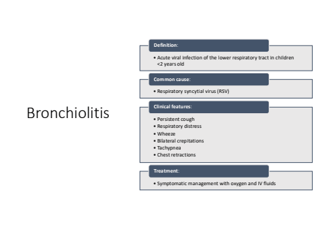 Bronchiolitis%u2022 Acute viral infection of the lower respiratory tract in children <2 years oldDefinition:%u2022 Respiratory syncytial virus (RSV)Common cause:%u2022 Persistent cough%u2022 Respiratory distress%u2022 Wheeze%u2022 Bilateral crepitations%u2022 Tachypnea%u2022 Chest retractionsClinical features:%u2022 Symptomatic management with oxygen and IV fluidsTreatment: