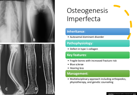 Osteogenesis ImperfectaInheritance:%u2022 Autosomal dominant disorderPathophysiology:%u2022 Defect in type 1 collagenKey features:%u2022 Fragile bones with increased fracture risk%u2022 Blue sclerae%u2022 Hearing lossManagement:%u2022 Multidisciplinary approach including orthopedics, physiotherapy, and genetic counselingThis Photo by Unknown Author is licensed under CC BY