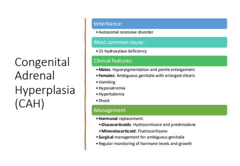 Congenital Adrenal Hyperplasia (CAH)Inheritance:%u2022Autosomal recessive disorderMost common cause:%u202221-hydroxylase deficiencyClinical features:%u2022Males: Hyperpigmentation and penile enlargement%u2022Females: Ambiguous genitalia with enlarged clitoris%u2022Vomiting%u2022Hyponatremia%u2022Hyperkalemia%u2022ShockManagement%u2022Hormonal replacement:%u2022Glucocorticoids: Hydrocortisone and prednisolone%u2022Mineralocorticoid: Fludrocortisone%u2022Surgical management for ambiguous genitalia%u2022Regular monitoring of hormone levels and growth