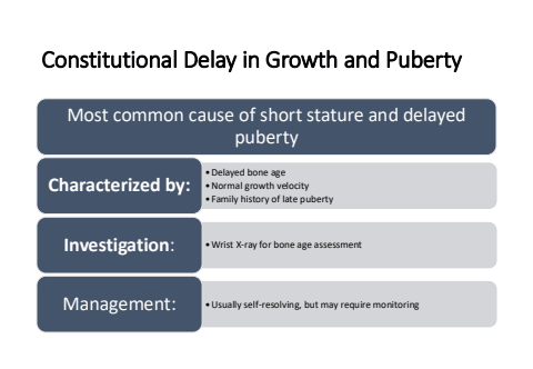 Constitutional Delay in Growth and PubertyMost common cause of short stature and delayed puberty%u2022Delayed bone age%u2022Normal growth velocity%u2022Family history of late pubertyCharacterized by:Investigation: %u2022Wrist X-ray for bone age assessmentManagement: %u2022Usually self-resolving, but may require monitoring