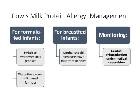 Cow's Milk Protein Allergy: ManagementFor formulafed infants:Switch to hydrolyzed milk productDiscontinue cow's milk-based formulaFor breastfed infants:Mother should eliminate cow's milk from her dietMonitoring:Gradual reintroduction under medical supervision