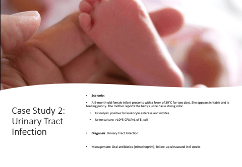 Case Study 2: Urinary Tract Infection%u2022 Scenario:%u2022 A 9-month-old female infant presents with a fever of 39%u00b0C for two days. She appears irritable and is feeding poorly. The mother reports the baby's urine has a strong odor.%u2022 Urinalysis: positive for leukocyte esterase and nitrites%u2022 Urine culture: >10^5 CFU/mL of E. coli%u2022 Diagnosis: Urinary Tract Infection%u2022 Management: Oral antibiotics (trimethoprim), follow-up ultrasound in 6 weeks