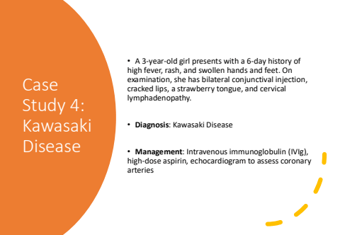 Case Study 4: Kawasaki Disease%u2022 A 3-year-old girl presents with a 6-day history of high fever, rash, and swollen hands and feet. On examination, she has bilateral conjunctival injection, cracked lips, a strawberry tongue, and cervical lymphadenopathy.%u2022 Diagnosis: Kawasaki Disease%u2022 Management: Intravenous immunoglobulin (IVIg), high-dose aspirin, echocardiogram to assess coronary arteries
