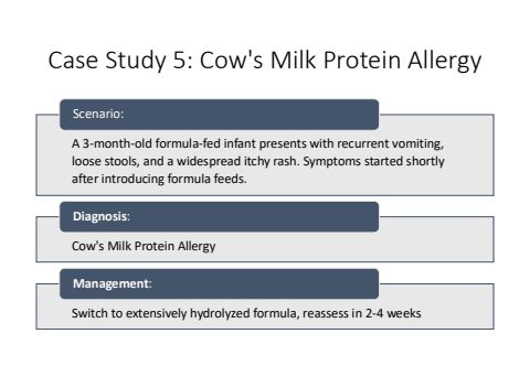 Case Study 5: Cow's Milk Protein AllergyA 3-month-old formula-fed infant presents with recurrent vomiting,loose stools, and a widespread itchy rash. Symptoms started shortlyafter introducing formula feeds.Scenario:Cow's Milk Protein AllergyDiagnosis:Switch to extensively hydrolyzed formula, reassess in 2-4 weeksManagement: