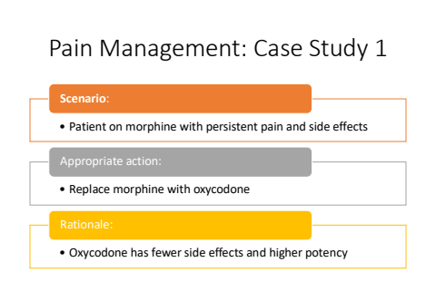 Pain Management: Case Study 1%u2022 Patient on morphine with persistent pain and side effectsScenario:%u2022 Replace morphine with oxycodoneAppropriate action:%u2022 Oxycodone has fewer side effects and higher potencyRationale: