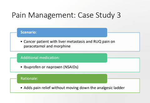 Pain Management: Case Study 3%u2022 Cancer patient with liver metastasis and RUQ pain on paracetamol and morphineScenario:%u2022 Ibuprofen or naproxen (NSAIDs)Additional medication:%u2022 Adds pain relief without moving down the analgesic ladderRationale: