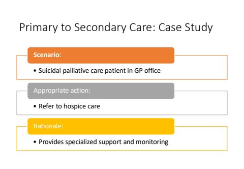 Primary to Secondary Care: Case Study%u2022 Suicidal palliative care patient in GP officeScenario:%u2022 Refer to hospice careAppropriate action:%u2022 Provides specialized support and monitoringRationale: